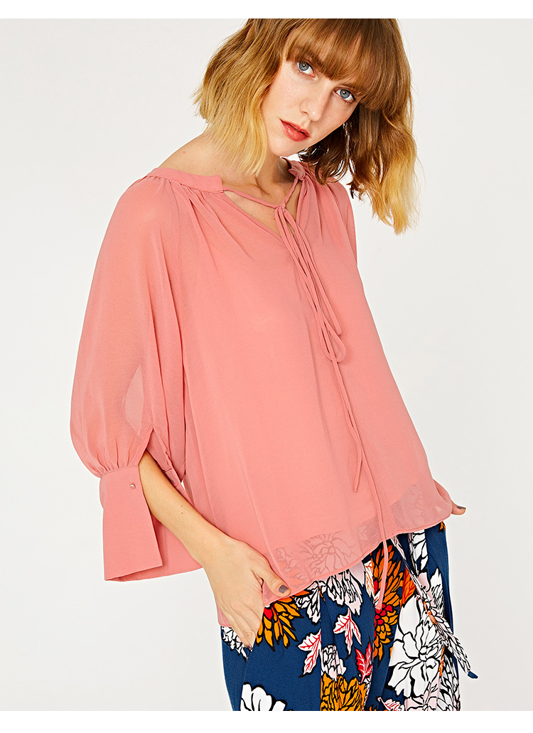 棕熊方鹿枝 女装薄纱透视拼接V领绑带套头衬衫WG29R2CE2000