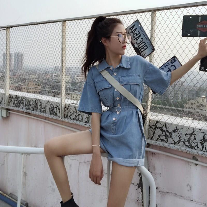 系带高腰显瘦牛仔连体裤bf风宽松阔腿连体衣翻领口袋卷边短裤女夏
