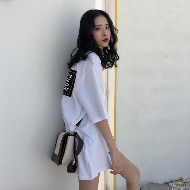 2018春夏新款短袖印花宽松显瘦上衣中长款简约百搭圆领T恤女学生