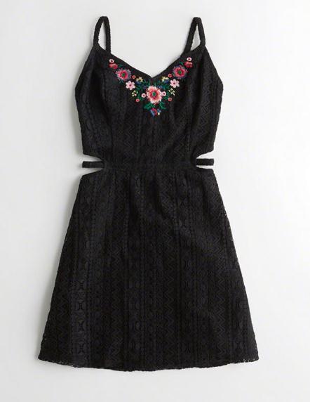 迷人束腰连衣裙,通体蕾丝面料,V 领款,饰有碎花刺绣,配可调式肩带,两侧挖空设计,后背抽褶饰条,进口商品