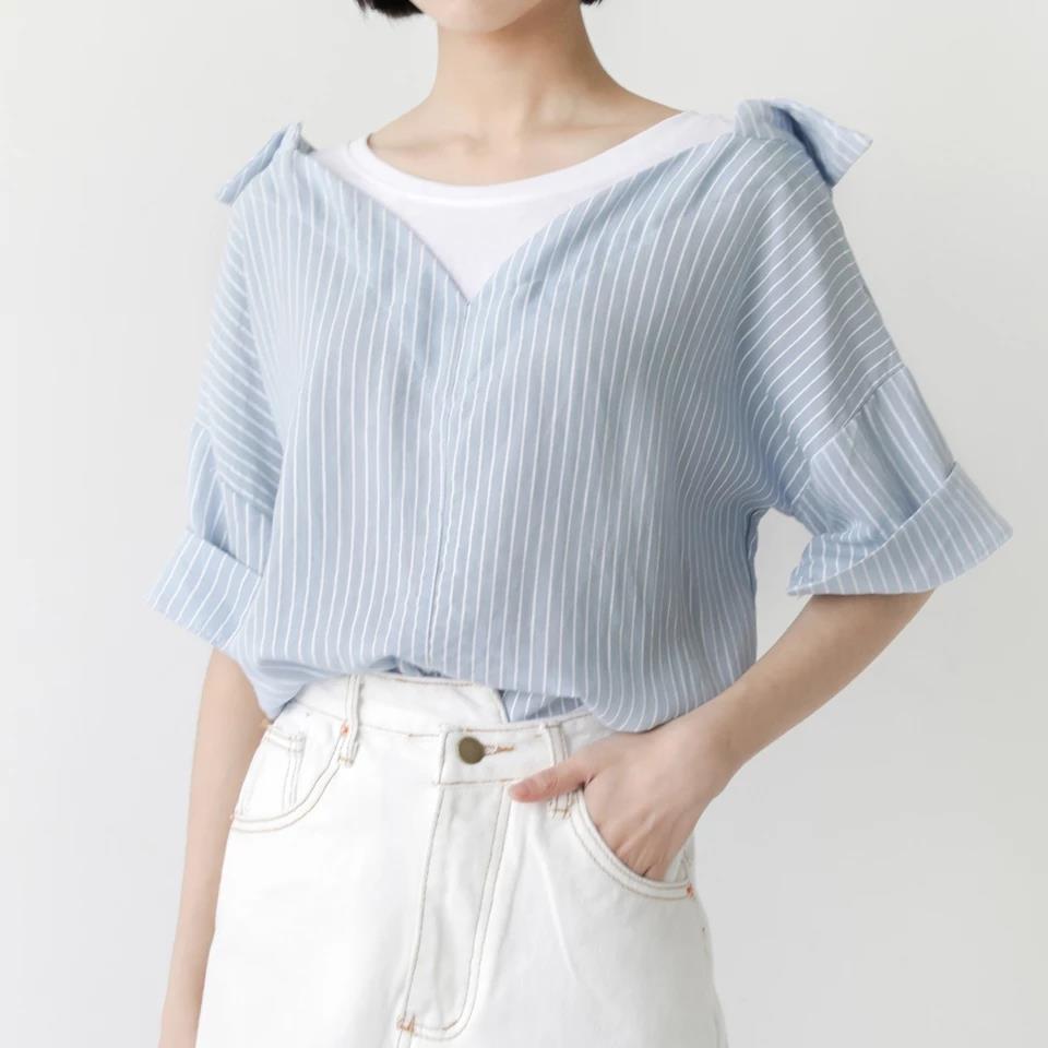 此产品为2018年春夏新款,衣长为常规款,袖长为短袖,袖型为蝙蝠袖,领型为圆领,图案条纹,款式细节是拼接,材料为棉,尺码为均码。