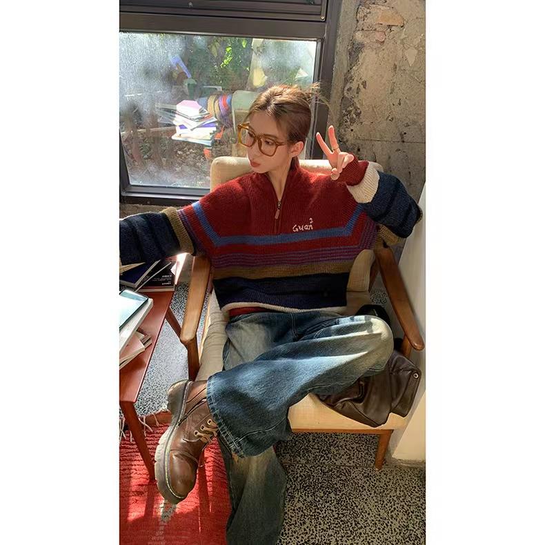 2022新款红色毛衣女秋冬内搭日系复古立领上衣设计感小众宽松针织衫