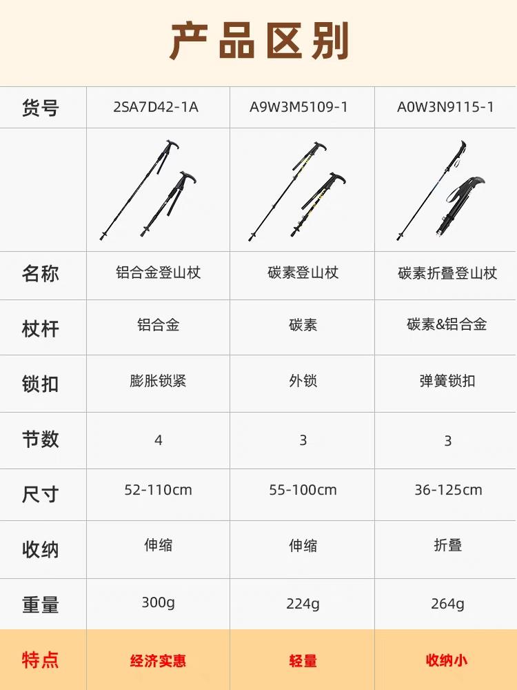 全碳素伸缩登山杖,防滑手柄,运用轻量科技技术,长短三节可调,抗氧化、坚韧耐用、方便携带,内置弹簧减震器,缓解运动过程中对手臂压力等冲击压力,减少身体耗能,耐磨顺杖尖,轻松抓地,适用于徒步、登山、远足等户外运动。