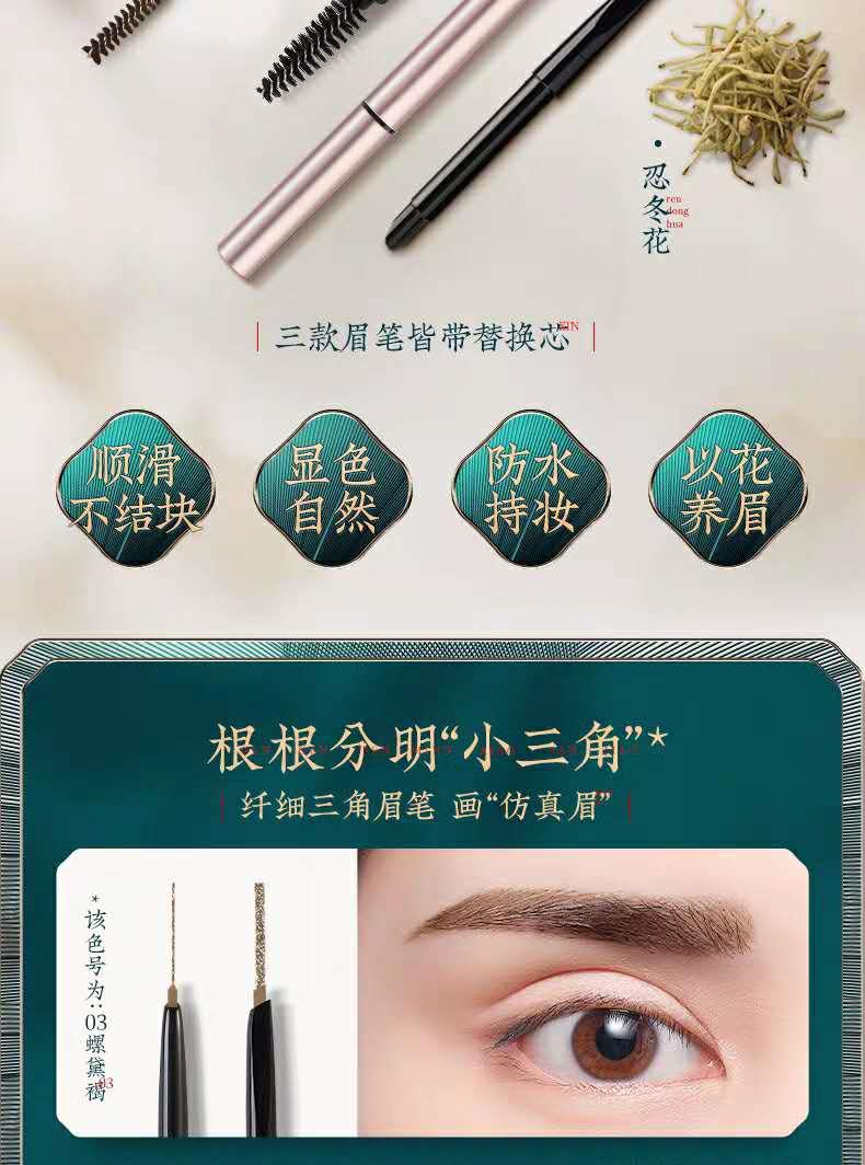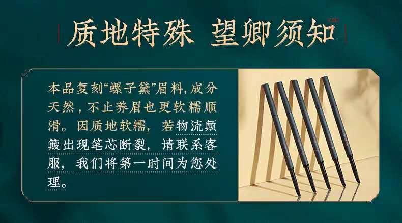 本品复刻“螺子黛”眉料,成分天然,不止养眉也更软糯顺滑。使用时旋出1-2mm最佳,油性皮肤画眉前应做好眉部定妆。