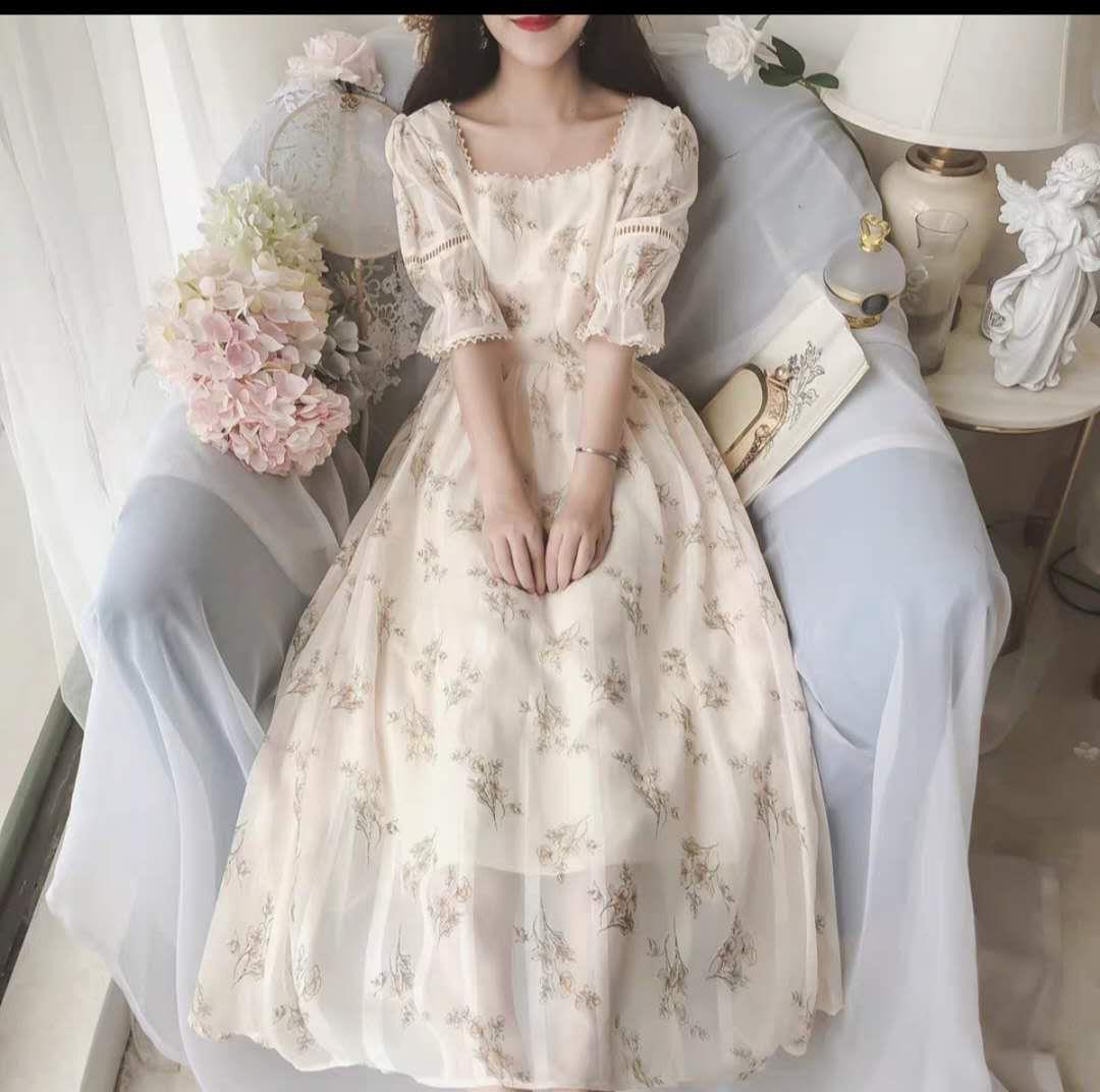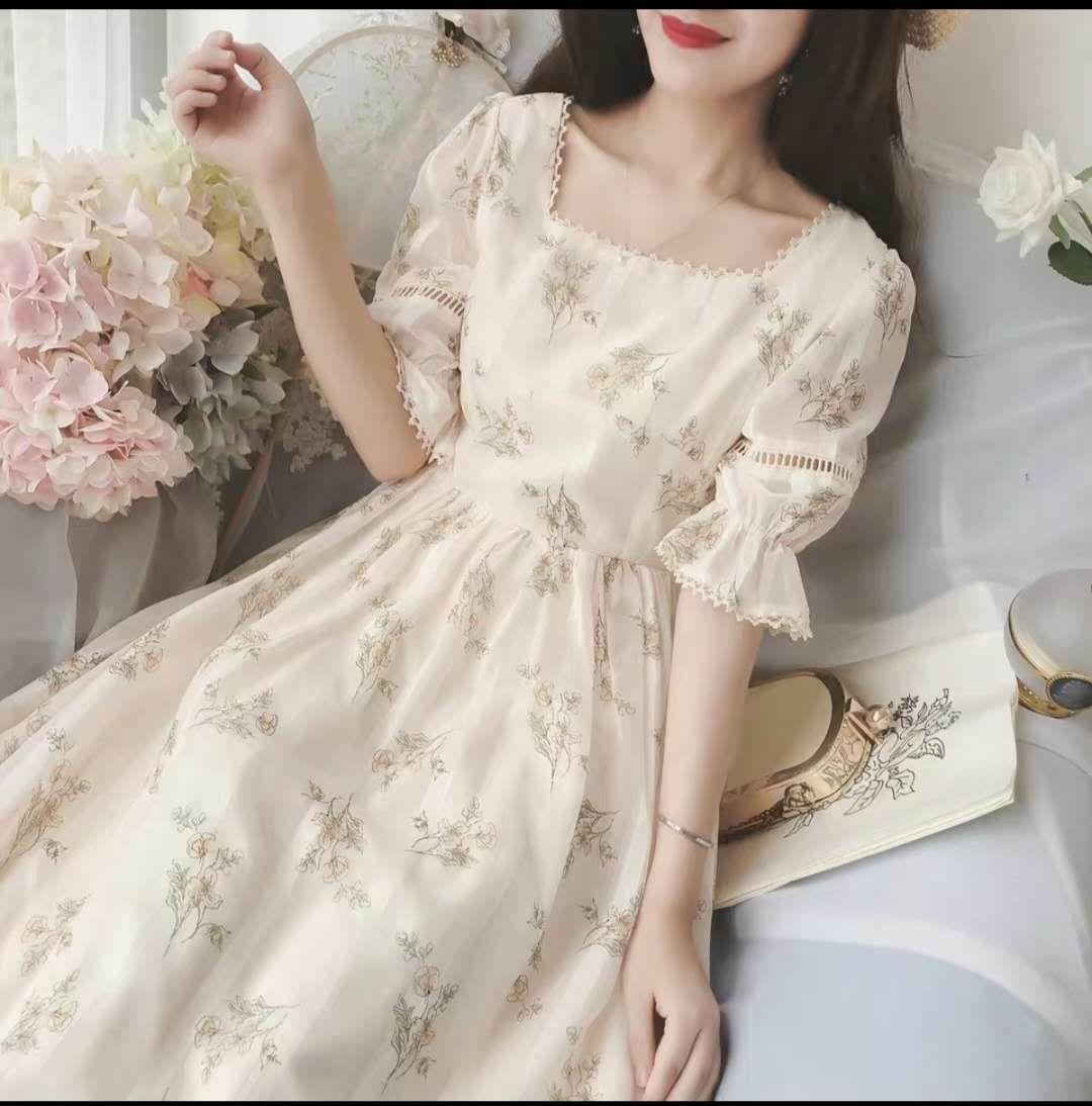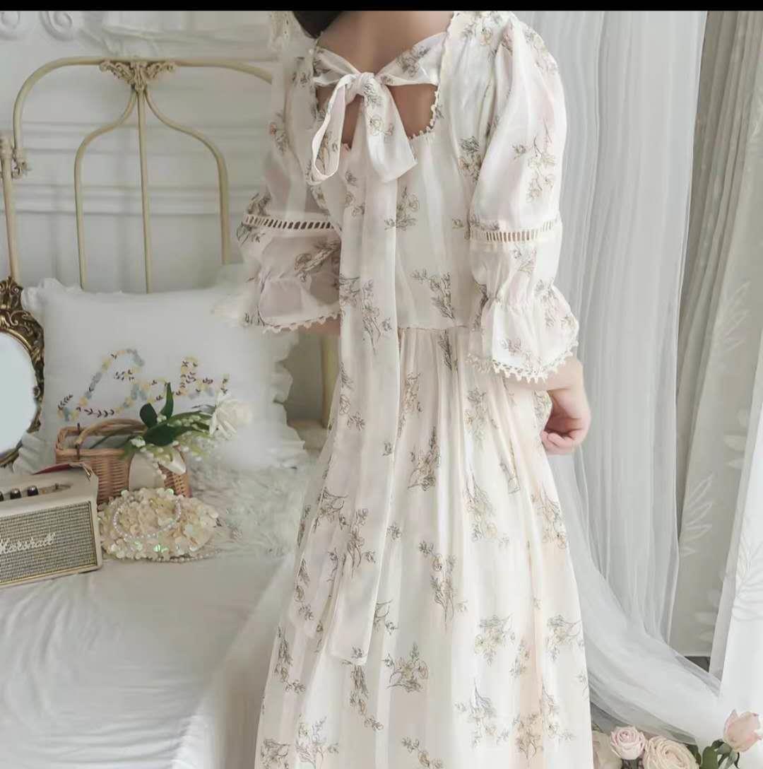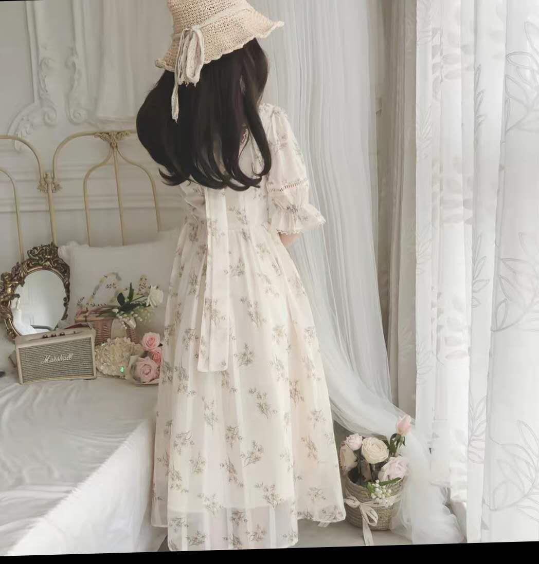 落跑公主2020夏小清新法式复古宫廷碎花方领收腰雪纺连衣裙仙女裙