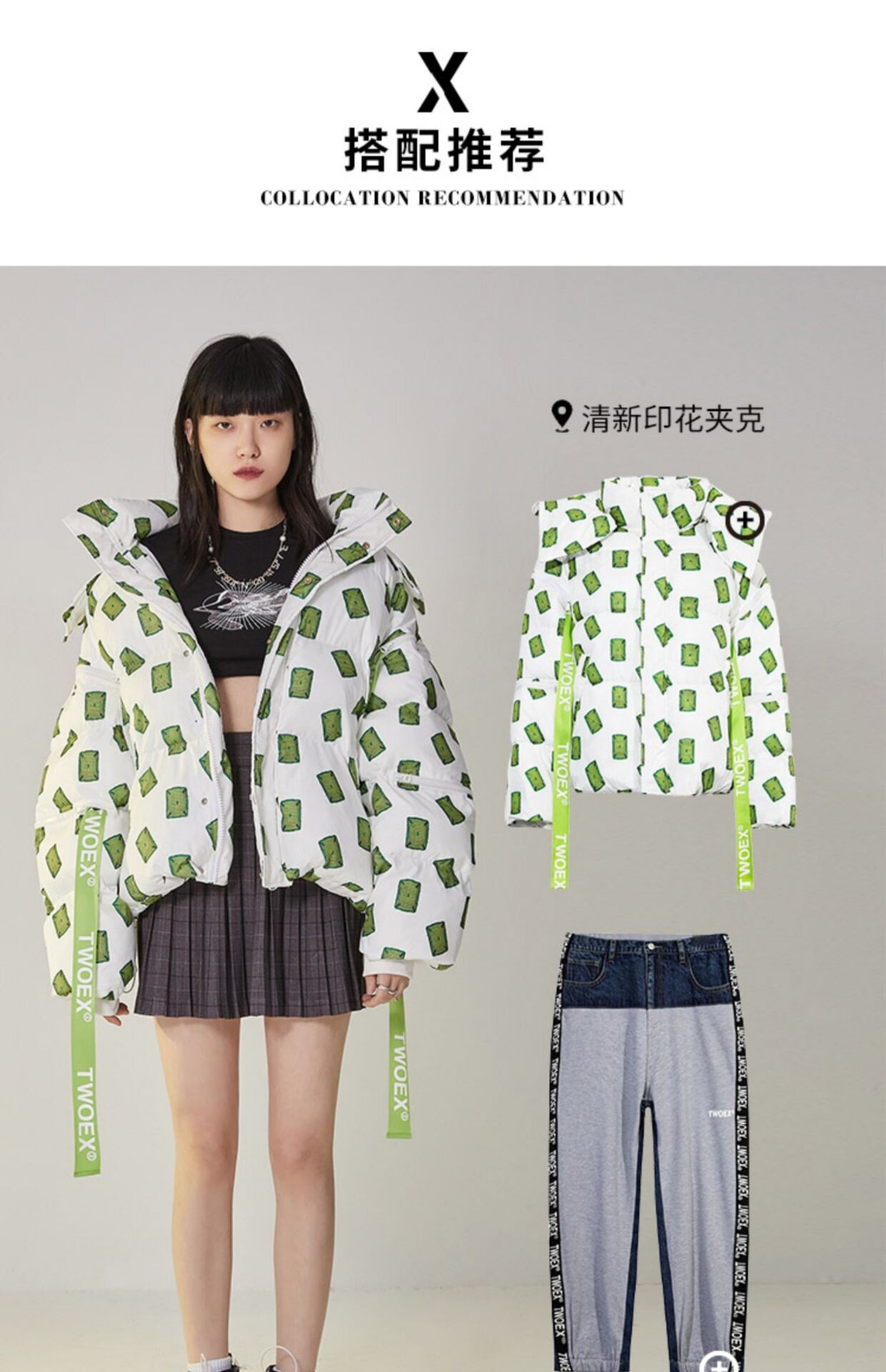动漫周边 > 服饰 > TWOEX2潮牌清新印花飘带棉衣长袖印花通勤冬季带帽新款加厚酷棉服