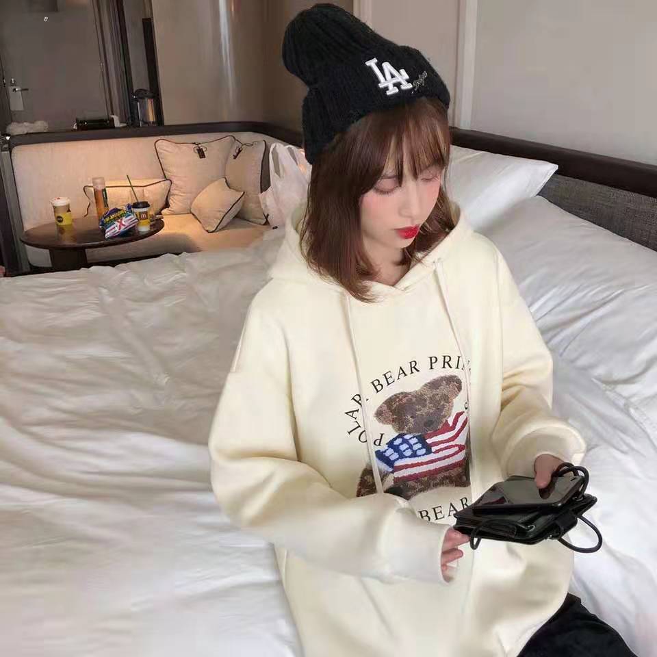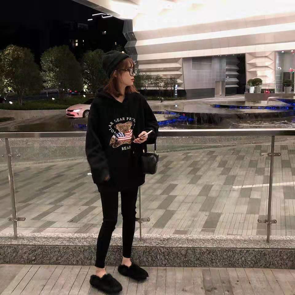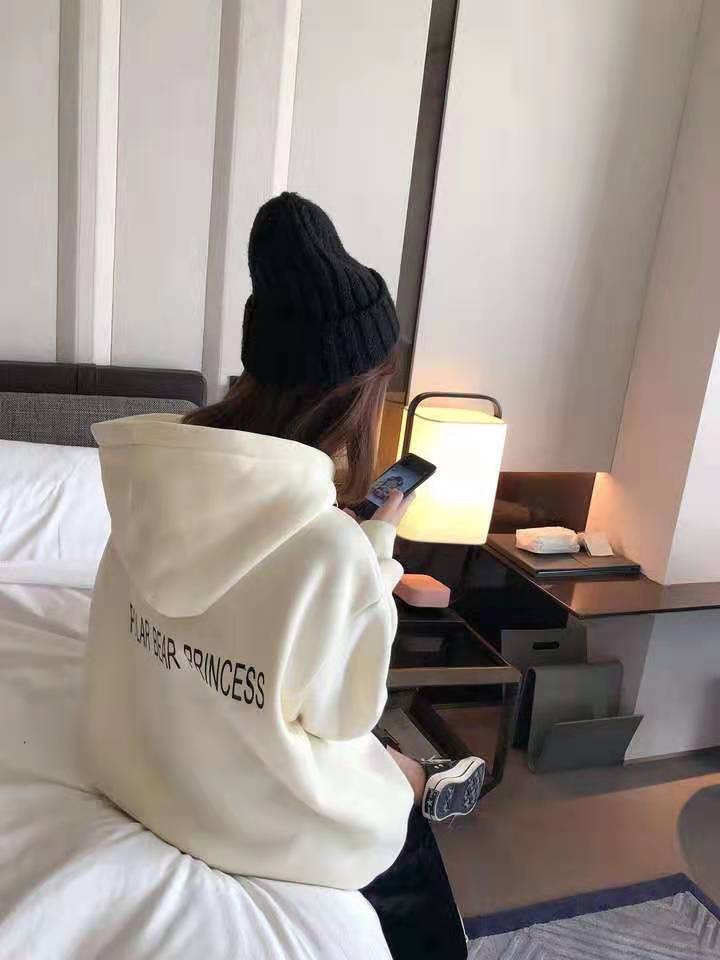 暖暖又萌萌的卫衣!内里是加绒的,保暖性很强;连帽的设计非常可爱,适合学生党,宽松的版型对身材的包容性很强,里面也可以塞很多衣服,搭配半身裙或者牛仔裤都可以!