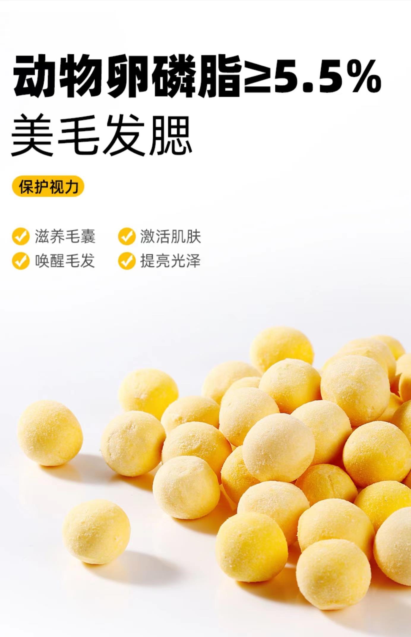 冻干蛋黄中含有鸡肉粒、鸡肝、三文鱼生骨等。我们严选优质原材料,不添加任何防腐剂,保证宠物食品的安全。在其中特别添加蛋黄粒,富含天然卵磷脂,保护皮毛,增加毛量和光泽度。