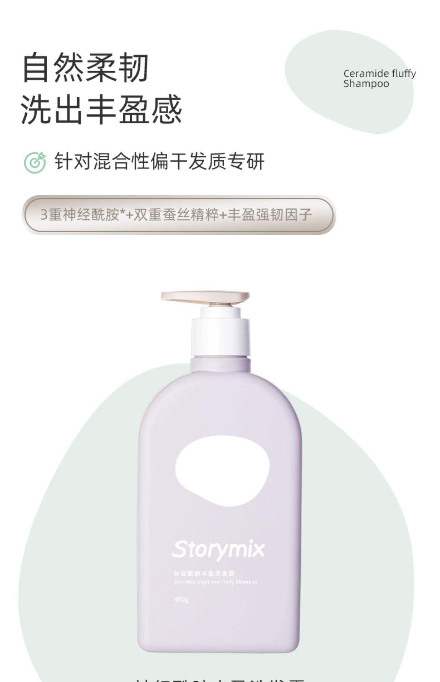 品牌:Storymix/混合故事品名:神经酰胺洗发露功效:深层滋养 温和清洁、修护