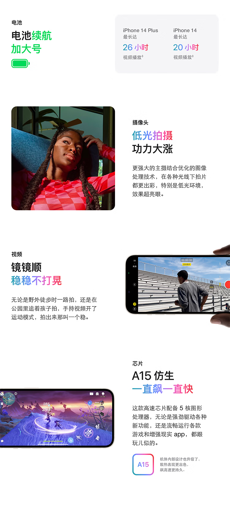 商品券满5999减800。是国行正品的,全国联保总结 iPhone 14非常不错,第一时间开售就果断买了一台,星光色典雅时尚,在灯光下不同角度,可以呈现不同的颜色,并且很耐看。外形外观没有多大改变,刘海屏有较大的变化,摄像头排布没有变化,运行速度挺快,流畅度也没的说