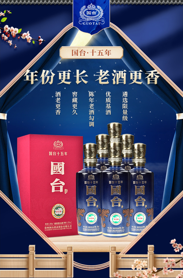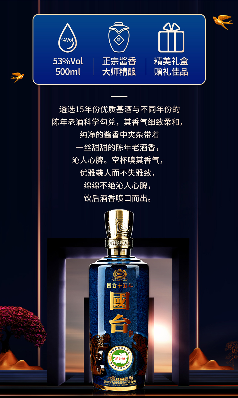 国台十五年酒产地位于贵州省茅台镇,主要用料有:水、高粱、小麦,口味:酱香,酒精度:53%。