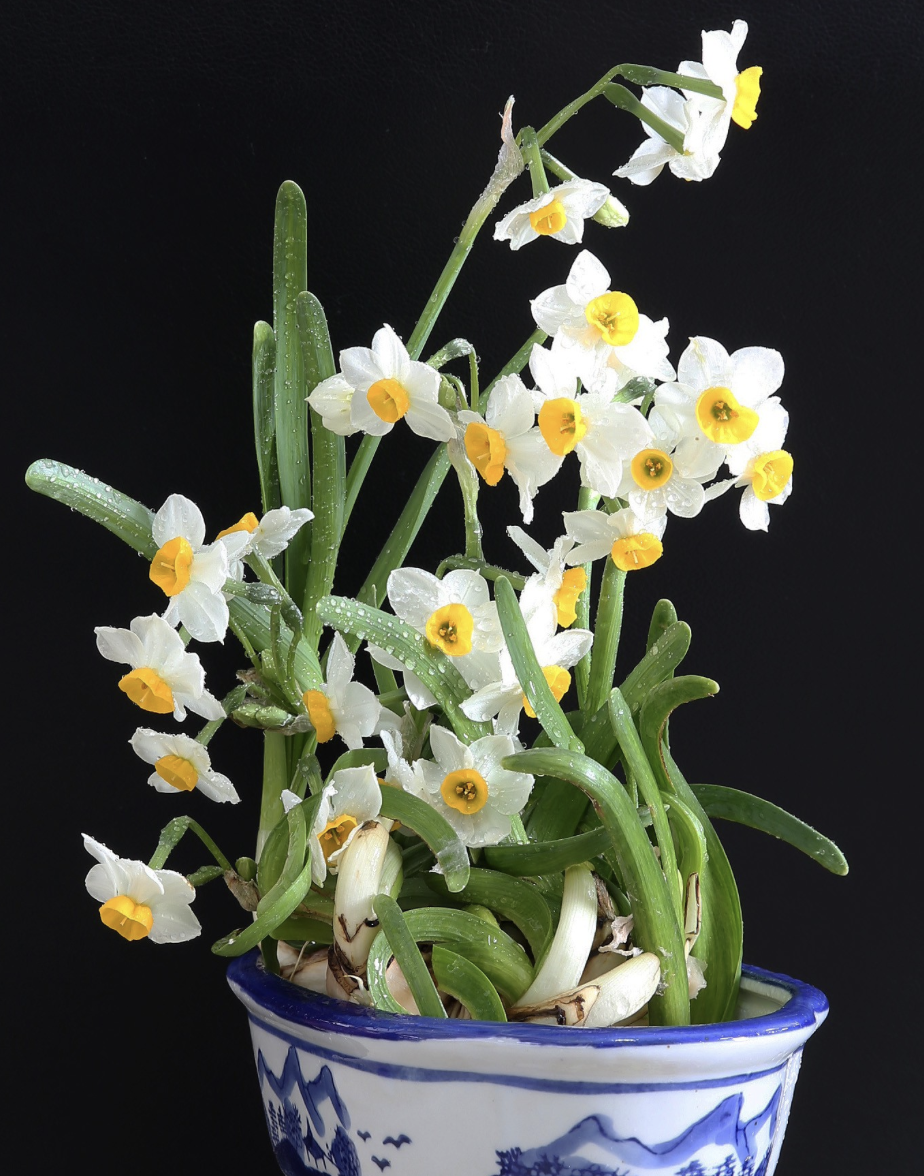 中国水仙,是多花水仙的一个变种。是石蒜科多年生草本植物。水仙的叶由鳞茎顶端绿白色筒状鞘中抽出花茎(俗称箭)再由叶片中抽出。一般每个鳞茎可抽花茎1-2枝,多者可达8-11枝,伞状花序。花瓣多为6片,花瓣末处呈鹅黄色。花蕊外面有一个如碗一般的保护罩。鳞茎卵状至广卵状球形,外披棕褐色皮膜。叶狭长带状,蒴果室背开裂。花期春季。