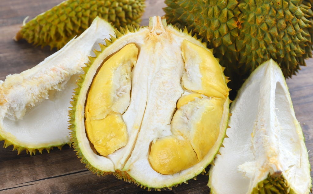榴莲(Durio zibethinus Murr.)是一种热带常绿乔木,果实足球大小,果皮坚实,密生三角形刺,果肉由假种皮的肉包组成,肉色淡黄,粘性多汁,是一种极具经济价值的水果。榴莲原产于东南亚热带地区,具有浓烈的异香,风味独特,被称为“热带果王”。12
