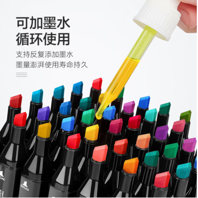 2. **双头设计**:标笔通常配备双头,一侧为笔尖,适用于细节描绘;另一侧为刷头,适合大范围上色和涂抹,增加了使用的灵活性。