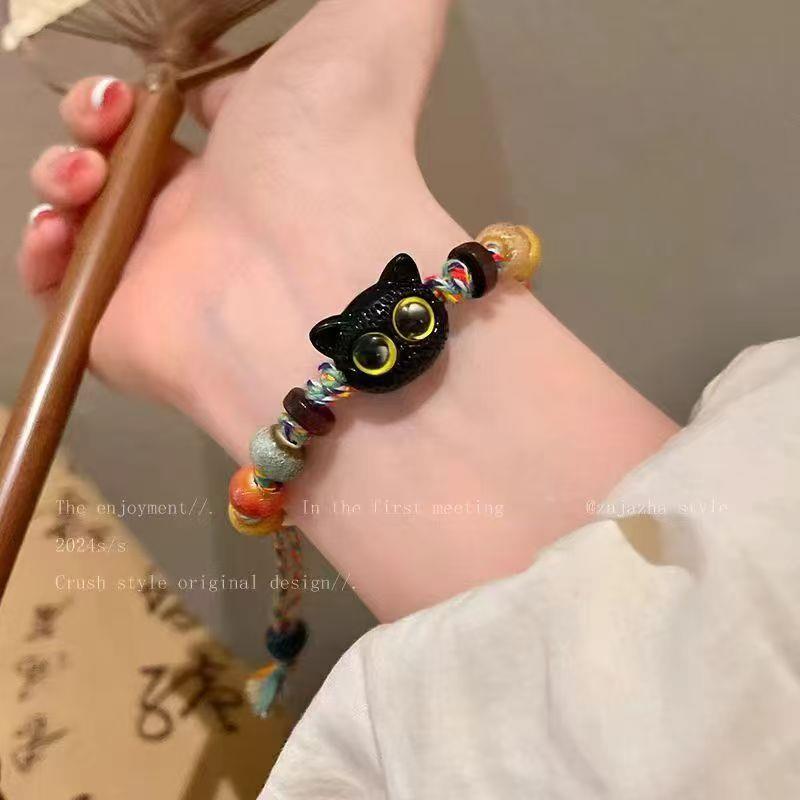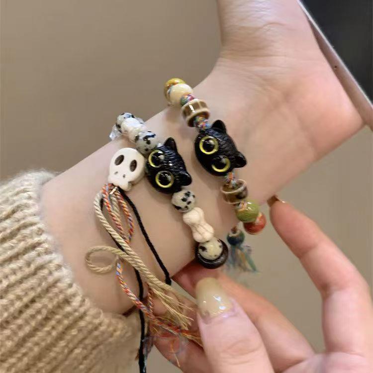 骷髅猫咪变编织绳手链女小众设计感甜酷中国风流彩色仿陶瓷手串手饰