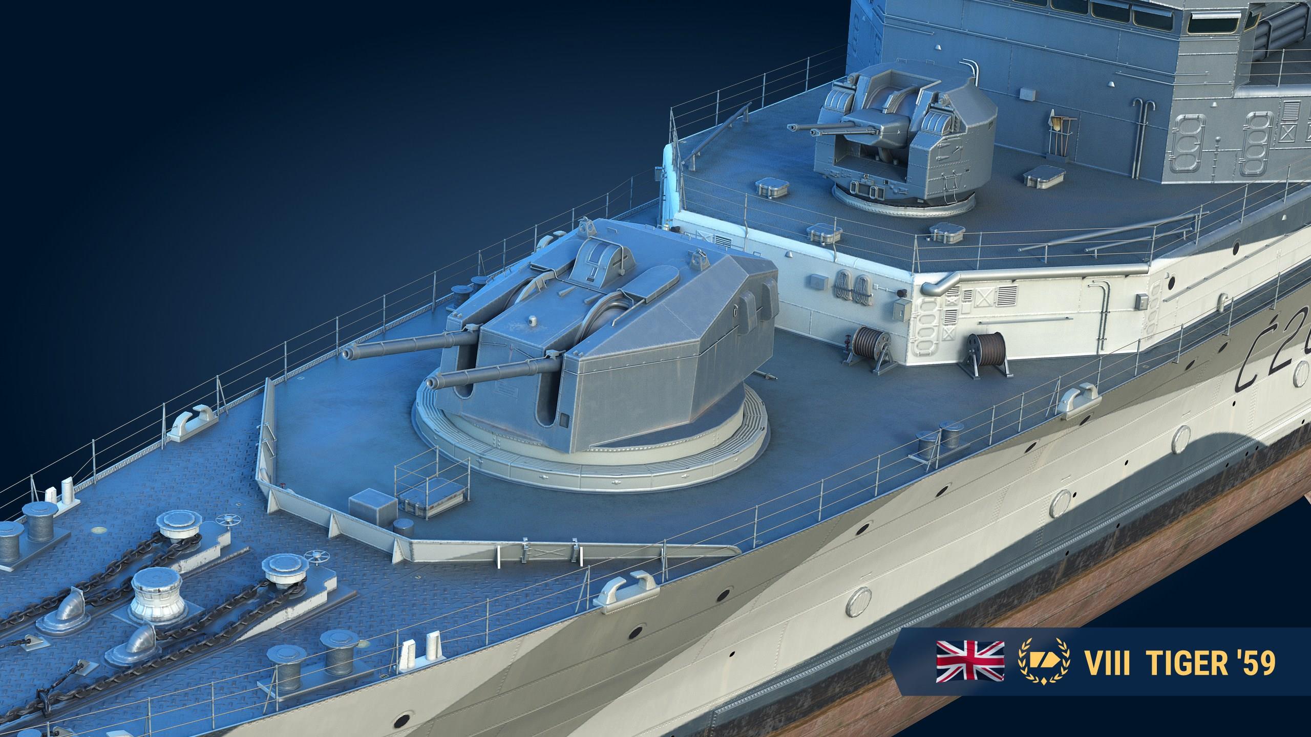 虎59号是皇家海军最后的火炮巡洋舰之一,在2座回转速度较快的炮塔中装备了4门152毫米速射火炮。