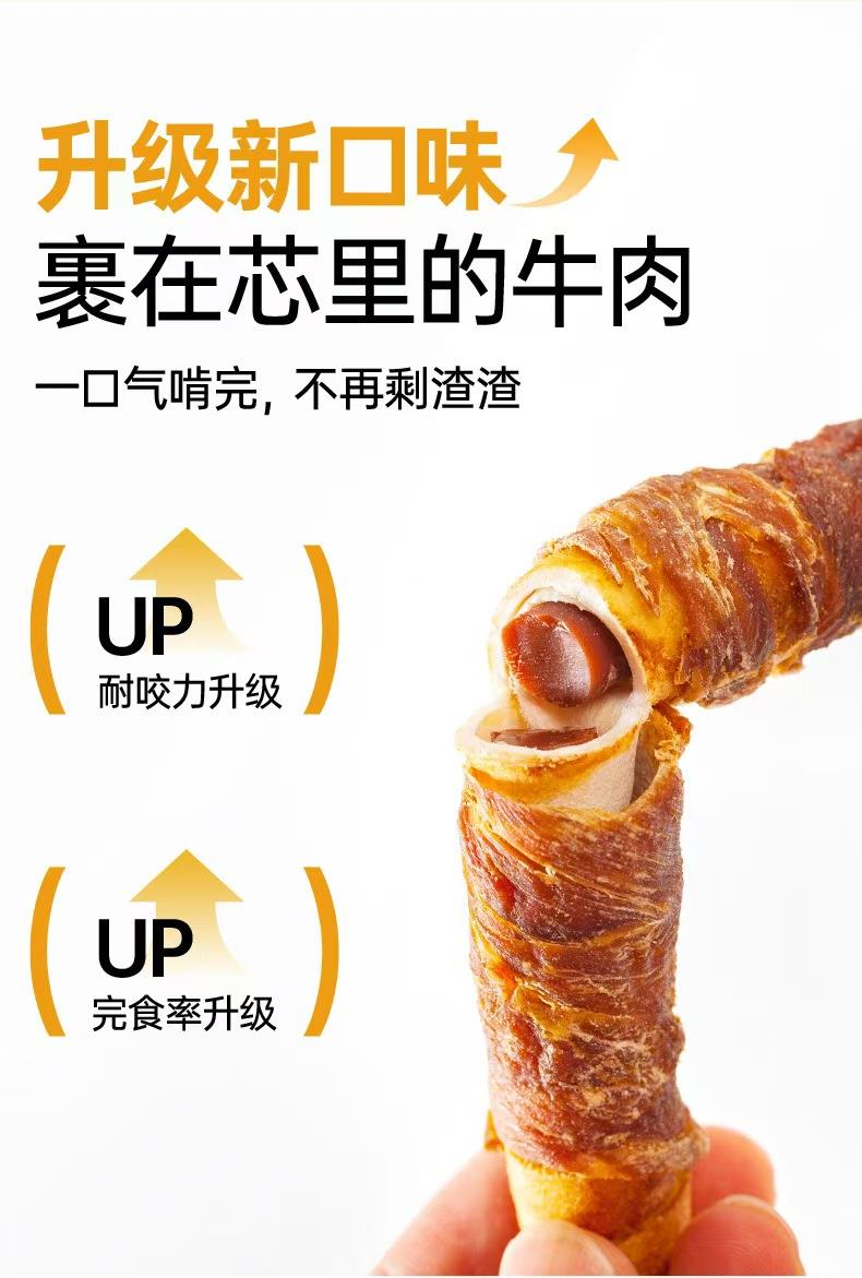 美味诱惑:鸡肉与牛肉缠绕夹心设计,让狗狗爱不释口,满足其肉食天性。