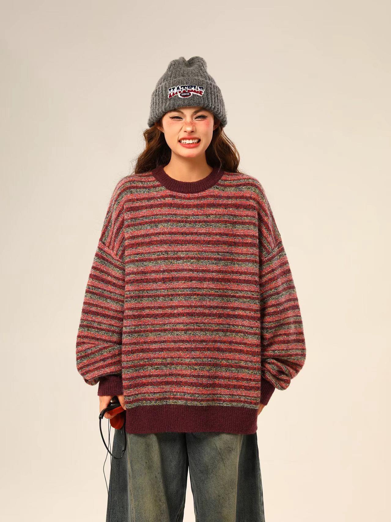 冬季,氛围感,条纹,毛衣,慵懒,宽松,冬季氛围感条纹针织衫毛衣女复古慵懒风宽松上衣