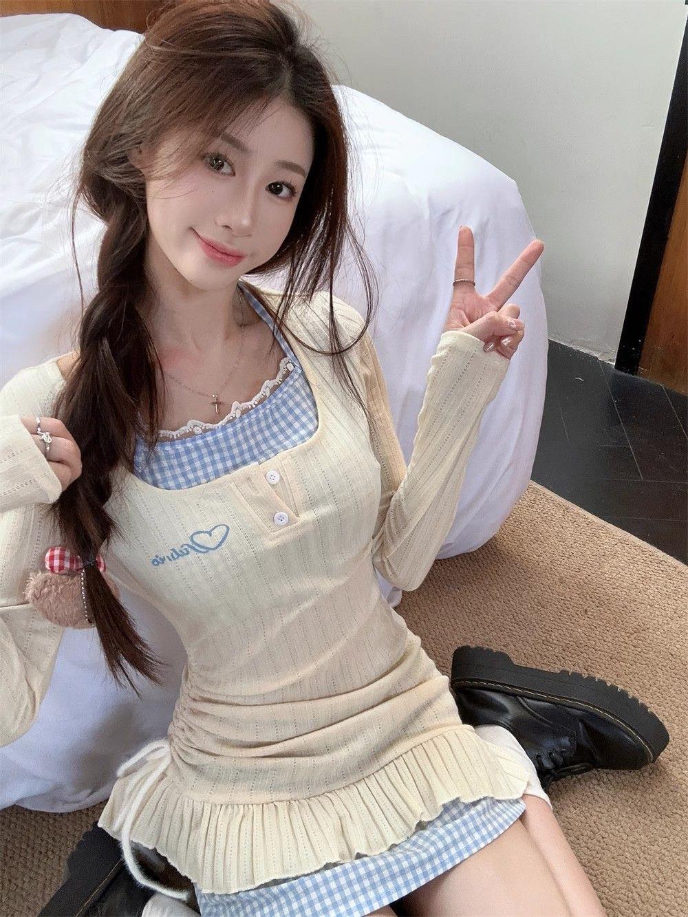 纯欲风挂脖连衣裙女秋季假两件裙子甜辣妹收腰不规则拼接叠穿短裙