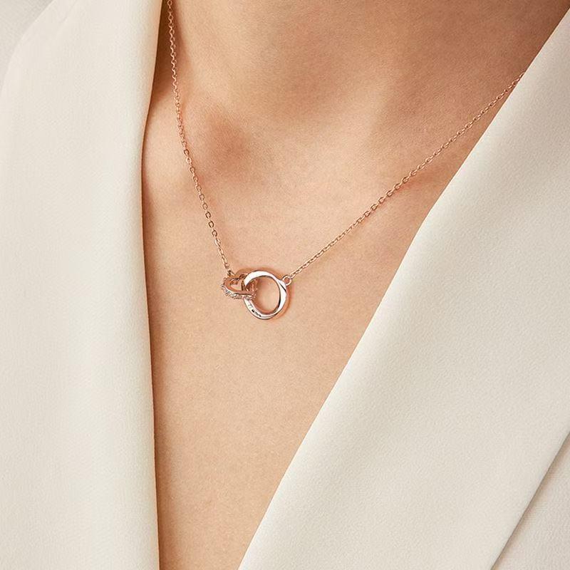 这款项链,将爱与美精妙融合。主体由两个别致的环相互交织,简约线条勾勒出时尚轮廓,流畅且优雅。其中一环之上,镶嵌着闪耀的美钻,颗颗晶莹剔透,在光线照耀下,折射出迷人火彩,瞬间抓住众人目光,为项链增添灵动与华丽之感。