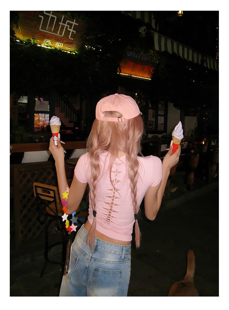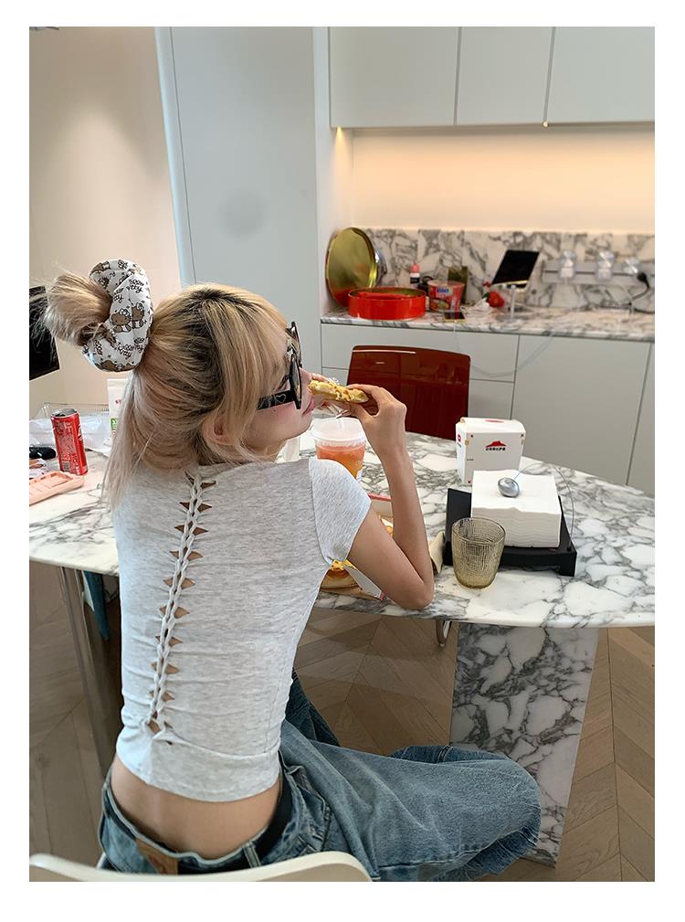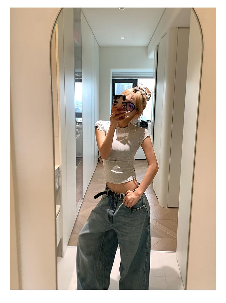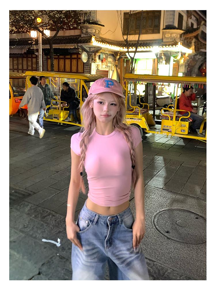 猎奇原创夏季美式纯欲正肩修身短袖T恤女辣妹基础款圆领紧身短上衣