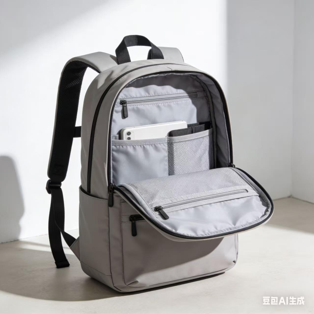屿风通勤双肩包专为都市打工人与学生党打造,兼顾实用与颜值,承包你的日常出行。精选高密防泼水尼龙面料,耐磨抗造不易变形,雨天出行也能护住包里的电脑、书本;轻量化设计,包身自重仅280g,装满物品也无负重感。人体工学加宽肩带+透气背板,久背不勒肩、不闷汗,通勤挤地铁、上学赶路都轻松。内部分区清晰,14英寸电脑隔层+平板袋+拉链暗格,课本、水杯、充电宝、化妆品各归其位,告别翻找麻烦;外置便捷插袋,随手放手机、公交卡超方便。简约纯色设计,黑、灰、米白三色百搭不挑衣,无论是搭配西装通勤,还是卫衣上学,都能轻松hold住。