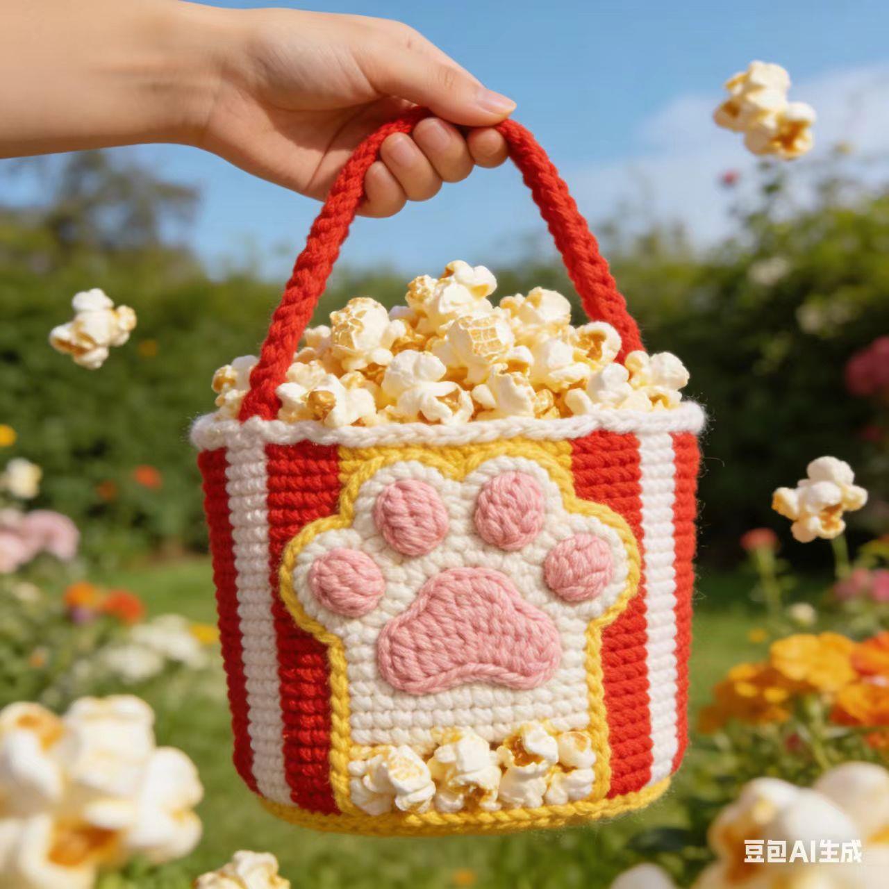 奶黄色粗毛线钩织出立体玉米粒纹理,焦糖色烤边花边自带复古氛围感,炸裂开的桶身造型打破常规,背出门回头率100%!